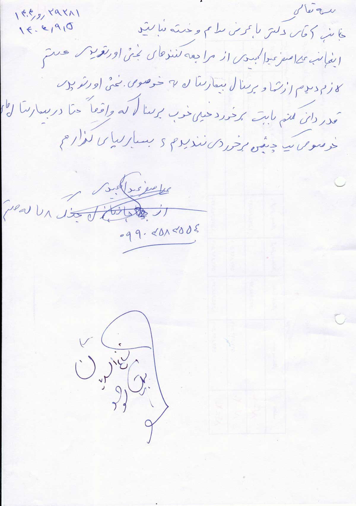 نامه تقدیر و تشکر یک جانباز از خدمات بیمارستان آیت الله هاشمی رفسنجانی(شرق)